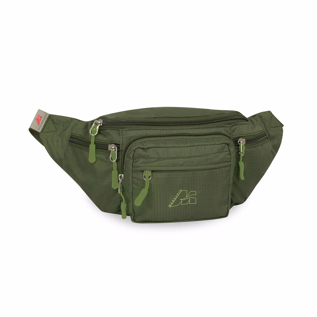 Torba za okoli pasu s številnimi žepi in nastavljivim pasom. Zadnji žep za dokumente in sprednji žep z zadrgo za dodatke.